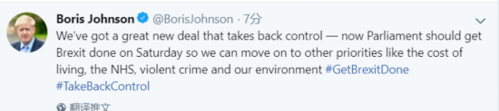 英国首相约翰逊17日在社交平台宣布,“我们已经得到了一份很棒的新协议,英国议会应该在周六通过协议。”同时,他表示这项新协议有助于“收回控制权”。