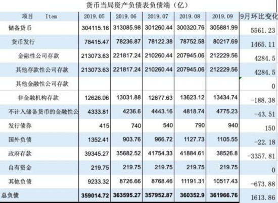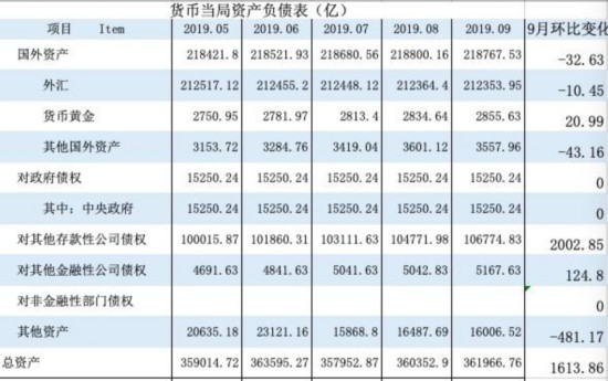 在8月扩表后,中国央行9月再度扩表。央行最新公布的资产负债表显示,2019年9月末中国央行资产总规模为36.19万亿(约5.1万亿美元),相比上月末环比扩张1613亿元。