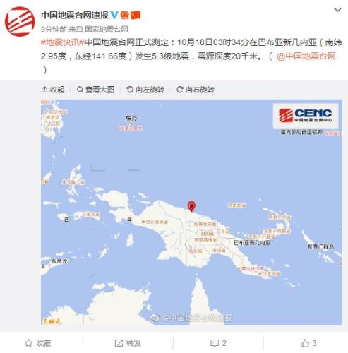 10月18日3时34分在巴布亚新几内亚(南纬2.95度,东经141.66度)发生5.3级地震,震源深度20千米。