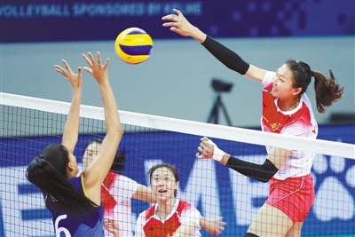 10月17日,中国队球员袁心玥(右一)在比赛中进攻。