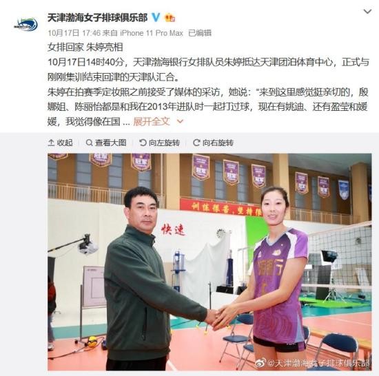 中新网客户端10月18日电 据天津女排官方微博消息,世界杯后加盟天津女排的朱婷亮相天津团泊体育中心,与刚刚集训结束回津的天津队汇合。谈及加盟天津队,朱婷表示“来到这里感觉挺亲切的”。朱婷曾与天津女排球员殷娜、陈丽怡并肩作战,如今队中主力姚迪、李盈莹和王媛媛则是朱婷现在的国家队队友,也让朱婷找到了“在国家队的感觉”。