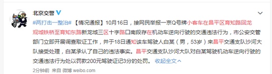 荔枝新闻讯 据北京交警消息,10月16日,接网民举报一京Q号牌小客车在昌平区育知路回龙观城铁桥至育知东路新龙城三区十字路口南段存在机动车逆向行驶的交通违法行为,市公安交管部门立即开展调查取证工作,并于18日通知该车驾驶人白某(男,53岁)来昌平交通支队沙河大队接受处理,白某承认了自己的违法事实。昌平交通支队沙河大队对白某驾驶机动车逆向行驶的交通违法行为处以罚款200元驾驶证记3分的处罚。