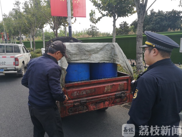现场,夫妇对三轮车桶内装运的餐厨废弃物——半桶泔水予以承认。经执法人员进一步调查,这对章姓夫妇是居住在临近江北新区的安徽省某县居民,称自家养猪需要,来新区偷偷收运餐饮单位泔水。