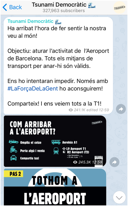 报道还称,这款应用程序于本月14日首次上线。当天,9名加区“独立派”前高官被判刑,多次发起示威活动的“海啸民主”组织通过这款APP向成千上万的用户发送了“占领巴塞罗那机场”的信息。报道称,很多加泰罗尼亚年轻人很快响应。