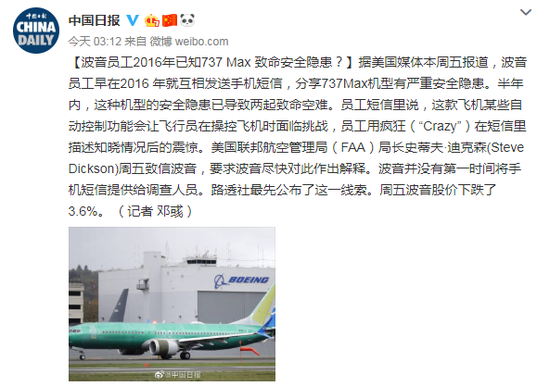 据美国媒体本周五报道,波音员工早在2016年就互相发送手机短信,分享737Max机型有严重安全隐患。半年内,这种机型的安全隐患已导致两起致命空难。员工短信里说,这款飞机某些自动控制功能会让飞行员在操控飞机时面临挑战,员工用疯狂(“Crazy”)在短信里描述知晓情况后的震惊。美国联邦航空管理局(FAA)局长史蒂夫·迪克森(Steve Dickson)周五致信波音,要求波音尽快对此作出解释。波音并没有第一时间将手机短信提供给调查人员。路透社最先公布了这一线索。周五波音股价下跌了3.6%。(记者 邓彧)