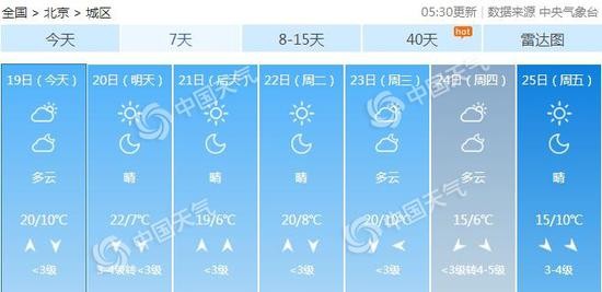 预计明天开始,受冷空气影响,北京白天北风3-4级,能见度将逐渐转好,多云转晴,最高气温继续小幅上升至22℃,户外活动的话,需做好防风措施。夜间仍有北风2-3级,气温比较低迷,最低气温只有7℃,注意保暖。下周一,北京北风逐渐停歇,气温小幅下降,最高气温19℃。