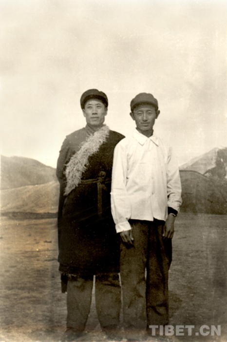 图为1965年,霍钟权(左)与西藏那曲县门堆乡牧民顿珠在那曲草原上的合影