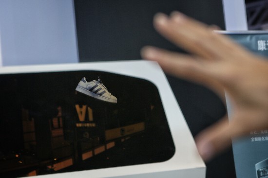 记者在该展区看到,现场很多参观者围着空气成像设备“观摩”。在特定的观看位置,可以看到手表、汽车等物品成像在空气中,通过互动感应装置,观看者还可控制观看物品的大小和方向。