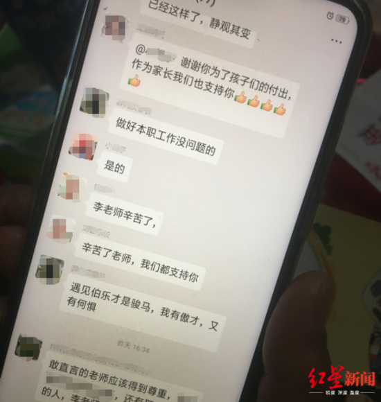 有学生家长告诉红星新闻记者,李田田的文章也被家长转发至家长群,不少家长给予支持态度:“感谢老师,孩子们和家长都支持你”、“敢直言的老师应该得到尊重”。