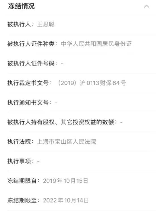 据公开信息显示,由王思聪担任董事长并持股100%的北京普思投资有限公司(简称“普思资本”)股权被上海市宝山区人民法院冻结,具体冻结数额不详,冻结日期为3年,自2019年10月15日起至2022年10月14日。