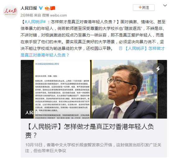 或许这封信的价值,在于提供了一个反思的契机:到底怎么做,才是真正对香港年轻人的未来负责?面对偏激、情绪化、甚至信奉暴力的年轻人,我们是听之任之、无原则为其开脱,还是坚决指出他们思想上的错误,纠正行动上的偏差?面对那些对自己人生感到迷茫、对国家发展模式感到困惑的年轻人,我们是同他们一起“哀叹”“愤慨”,还是用自己的学识和阅历,教会他们人生的道理,使他们明白一个社会得以维系的制度和规则?这些应该都不难回答,只不过需要拿出勇气和展现正气。倘若教师甚至深受尊重的大学校长也“随波逐流”,不辨是非、不讲对错,对极端激进的观点乃至暴力一味纵容,那不是真正爱护年轻人,而是在亲手毁了他们的未来。