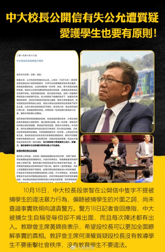 10月18日,香港中文大学校长段崇智发表公开信指出,校方逐一联络逾30位被捕同学,其中大部分称曾遭不合理对待,并亲述被拖延就医、求见律师家人无果、被逼搜身等。段崇智校长因此要求警方查明细节后清晰交待,并称将为被捕学生提供协助。这封信自发出后,引发广泛关注,但也带来巨大争议。有网友表示:“全信只呈现了被捕学生的一面之词,那些被激进分子伤害的学生和老师谁来代表呢?”这样的担忧,不无道理,值得我们认真对待和反思。