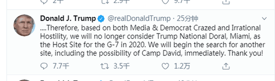 特朗普接着表示,“因此,基于媒体和民主党的疯狂和非理性的敌意,我们将不再考虑把‘特朗普多拉尔高尔夫俱乐部’作为2020年G7峰会的主办地。我们将立即开始寻找另一个地点,考虑包括戴维营的可能性。谢谢!”