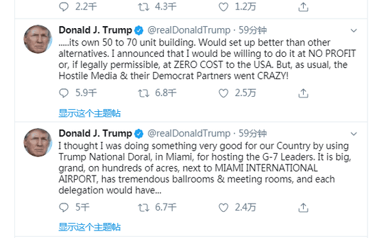 特朗普在推特上说:“我认为用迈阿密的‘特朗普多拉尔高尔夫俱乐部’接待七国集团领导人,是在为我们的国家做一些非常有益的事情。那里很大、很气派,占地数百英亩,紧挨着迈阿密国际机场,有巨大的舞厅和会议室,每个代表团将拥有50至70个单位的建筑物。这会比其他替代方案更好。我宣布,我愿意在没有利润的情况下,或者在法律允许的情况下,以零成本在美国做这件事。但和以往一样,充满敌意的媒体和他们的民主党合作伙伴疯了!”