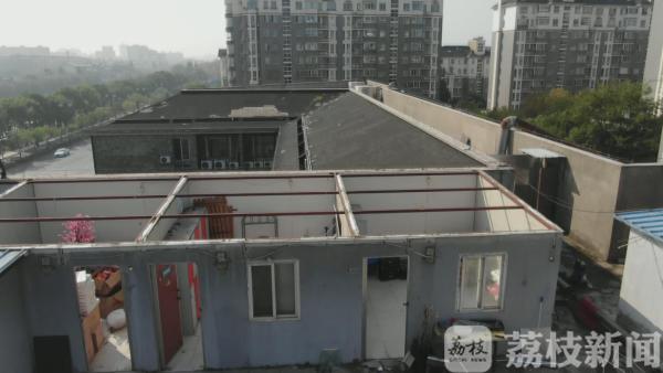 画面中这片呈U字形的板房,就是隐藏在高桥路金麦克KTV四楼楼顶的违建,总共有十多个房间,将近两百平米。由于楼顶的周边都是一米多高的围墙,所以很难被发现。近日,在接到市民举报后,辖区城管部门调用了无人机进行高空侦查。