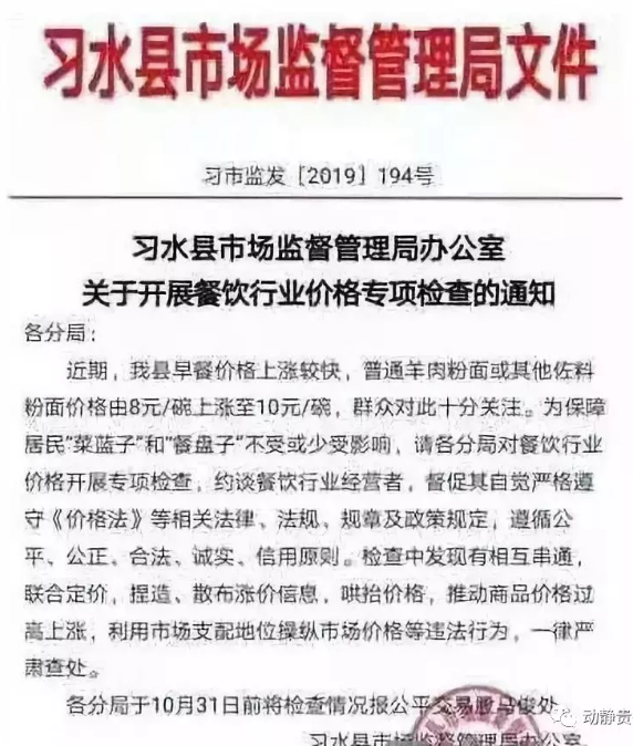 10月13日,习水县马临街道的多家早餐店经营者,被当地市场监管局约谈,并责令将已经涨上来的价格降回去。据称,当时,当地几家羊肉粉馆在“没有商量”的情况下,几乎同一天就将原先每碗8元的价格,上调到10元。对涨价理由,他们给出的解释是“猪肉价上涨带动了牛羊肉上涨”。