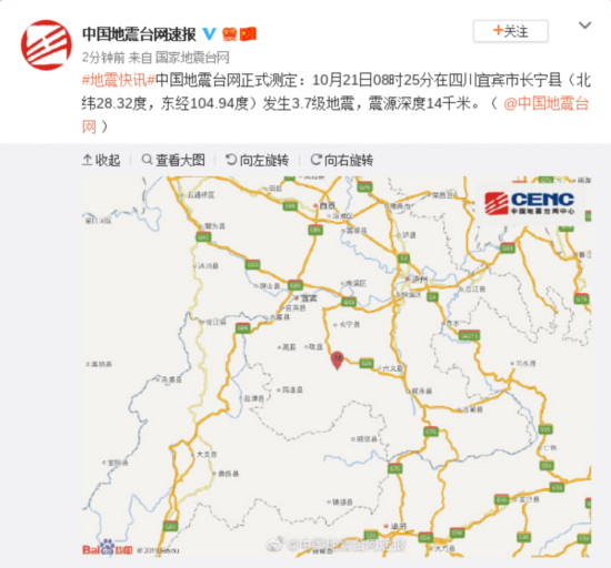中国地震台网正式测定:10月21日08时25分在四川宜宾市长宁县(北纬28.32度,东经104.94度)发生3.7级地震,震源深度14千米。