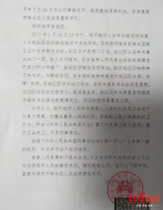 近日,红星新闻记者从田丰辩护律师、北京富力律师事务所律师殷清利处获悉,2019年8月,徐水区人民检察院作出不起诉决定,认为田丰为使家人人身权利免受正在进行的暴力侵害,对携凶器伤人的赵某,采取制止暴力侵害的防卫行为,属于正当防卫,不负刑事责任;徐水区人民法院准许检方撤诉。
