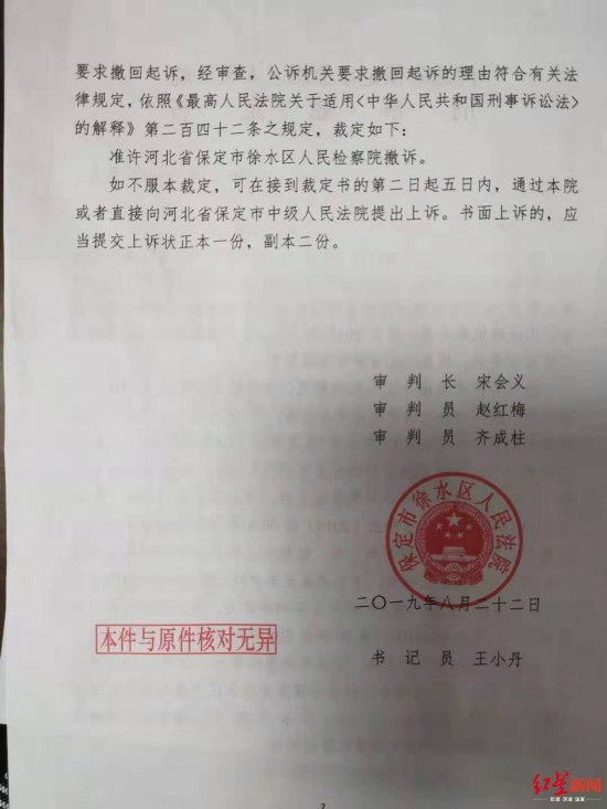 2019年8月22日,徐水区人民法院作出刑事裁定,准许徐水区人民检察院撤诉。