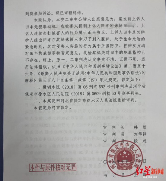 2019年5月,保定中院作出再审决定。红星新闻记者获取的《再审决定书》内容显示,本案中,二审出庭公诉人意见为:案发前田丰无犯罪动机,在被害人捅刺田某后,连续击打被害人的行为属于正当防卫;田丰及其辩护律师亦认为,田丰行为属于正当防卫。