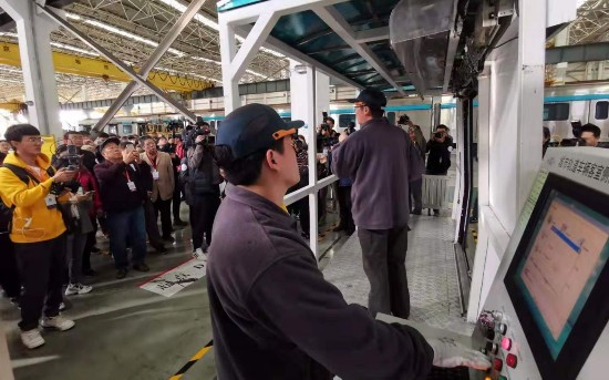 在今天的乘客开放日活动中,乘客代表参观了4号线马家堡车辆段,借助AR技术,了解京港地铁全寿命周期管理理念,以及列车、车门、空调、转向架等部件及其维修策略。