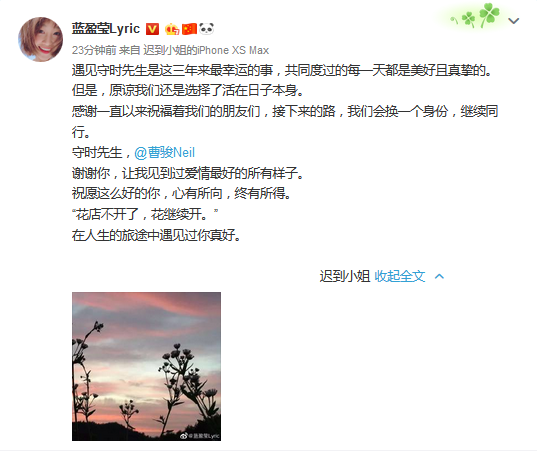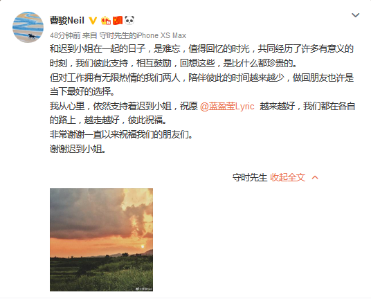 同时,曹骏也在微博发文承认分手一事,“和迟到小姐(蓝盈莹)在一起的日子,是难忘,值得回忆的时光,共同经历了许多有意义的时刻,我们彼此支持,相互鼓励,回想这些,是比什么都珍贵的。但对工作拥有无限热情的我们两人,陪伴彼此的时间越来越少,做回朋友也许是当下最好的选择。”