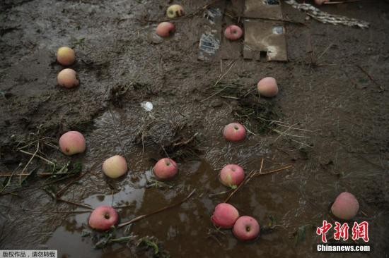当地时间10月15日,台风“海贝思”过后,日本长野县一处果园内,苹果散落在泥泞的地面。