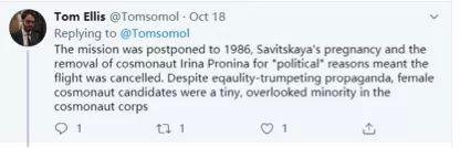 而来自美国一些学者的说法则是:这个项目被取消除了萨维特斯卡娅怀孕的原因,还有苏联内部政治斗争的因素,导致原本将和她搭配的另一名女宇航员被取消了资格。