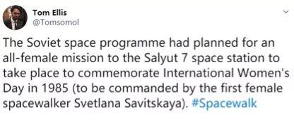 前苏联甚至还差点在1985年到1986年实现了如今美国实现的首次全女性太空行走。网络上的公开资料显示,当年苏联原本打算在1985年时在其“礼炮七号”空间站上用“全女性太空行走”的方式庆祝当年的“国际妇女节”,并由当时实现了女性首次太空行走的苏联宇航员萨维特斯卡娅领衔。可由于她怀孕了,项目不得不推迟到了1986年,但最终还是被取消了。