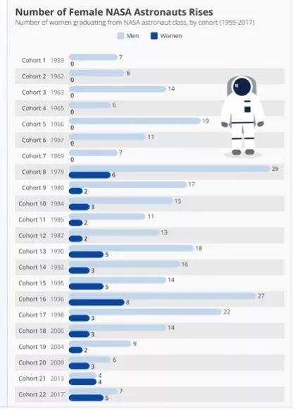 不过,由于美国申请成为宇航员的男性整体上还是远多于女性的,这便导致在1978年美国宇航局对女性宇航员申请者打开大门后,美国女宇航员的比例仍然远小于男性。