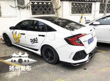 昨天上午8点,大虹桥路路边,停放着一辆“改装版”白色本田思域,从外表来看,车身涂鸦卡通人物,前后包围、车灯、轮胎、轮毂和排气管均存在改装痕迹。