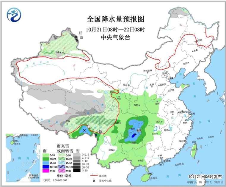 降雨方面,未来几天,西南地区仍是阴雨天气的主要阵营。不过总体来看,西南地区的降雨强度不算太强,普遍以小到中雨为主。根据中央气象台预报,10月21日08时至22日08时,新疆北部和南疆西部山区、青藏高原大部、川西高原、内蒙古东北部、黑龙江西北部等地的部分地区有小到中雪或雨夹雪,其中,新疆阿勒泰和塔城山区有大到暴雪(5-15毫米)。西南地区大部、西北地区东南部、黄淮西部、江汉中西部、江南西部、华南西部和南部等地有小到中雨,其中,西藏东南部、四川盆地东南部、重庆大部、贵州中北部等地的部分地区有大雨,贵州北部局地暴雨(50-60毫米)。新疆北部和东部、内蒙古东部、西藏中东部等地的部分地区有4-6级风。
