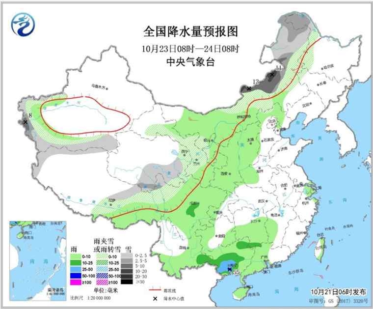 10月23日08时至24日08时,新疆南疆盆地、青海东南部、西藏东南部及西北部、内蒙古东部、黑龙江西北部等地有小到中雪或雨夹雪,局地有大到暴雪(5-14毫米),内蒙古中西部、西北地区东部、华北西部、黄淮西部、江南西部、西南地区大部、华南中西部、海南岛等地有小雨,其中四川盆地南部、广西中南部等地有中到大雨,局地有暴雨(50-55毫米)。内蒙古西部及东北部部分地区有4-5级风。