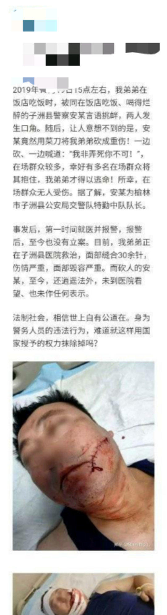 内容显示,19日下午,微博名为“陕a万有引力”的网友发布动态称,自己弟弟在子洲县一饭店,与当时同在饭店吃饭县公安局交警队安某发生冲突,随后他弟弟被安某用菜刀砍成重伤,并配有多张伤者在医院救治的照片。
