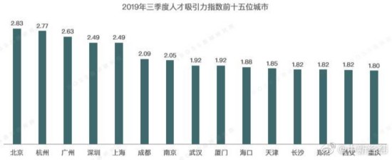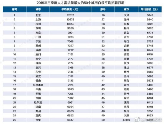 BOSS直聘数据显示,2019年三季度人才需求量最大的50个城市白领平均招聘月薪为8325元。北京白领平均月薪为12312元,领跑全国,位列榜单二、三位的上海、杭州平均月薪分别为10878元和10059元。在人才吸引力指数上,新一线城市中的成都、南京、武汉、天津、长沙、郑州、西安、重庆稳定在前15位。(薛宇飞)