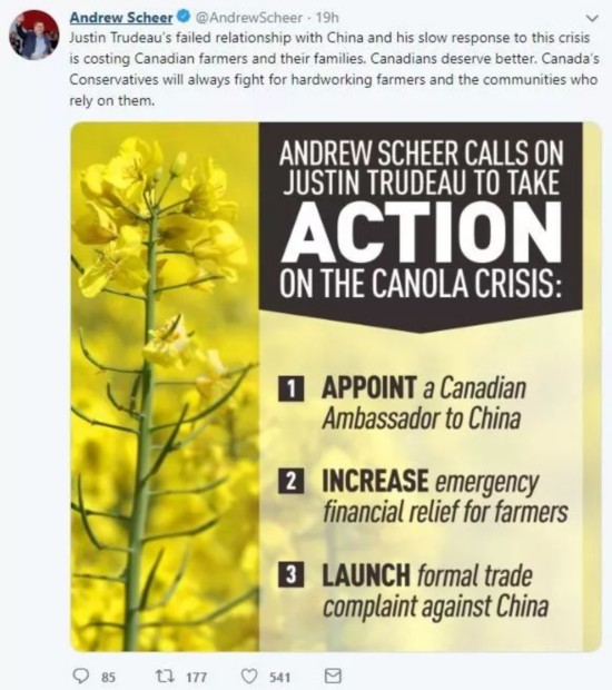 今年4月,中国进口商停止采购加拿大两家公司的油菜籽时,希尔在推特上祭出反击中国“三板斧”: