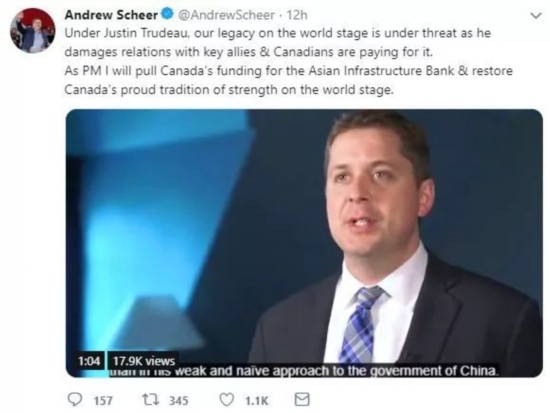2017年竞选党魁的时候,他已明确反对加拿大与中国商谈自由贸易。当上党魁之后,他继续反对加拿大参与亚投行。