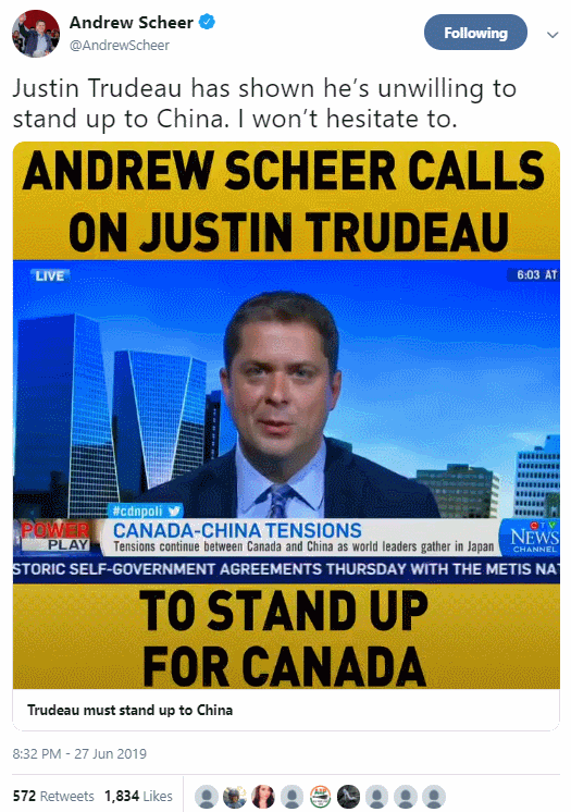 “加拿大人在为特鲁多犯的错而买单。我敦促特鲁多,对中国采取强有力的报复行动,并告诉中国,加拿大不会被摆布。”