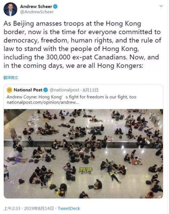 6月13日,希尔的表态还相对收敛,只是说“加拿大的保守党与香港人民站在一起”。等到了8月31日,他直接喊出“我们都是香港人”。