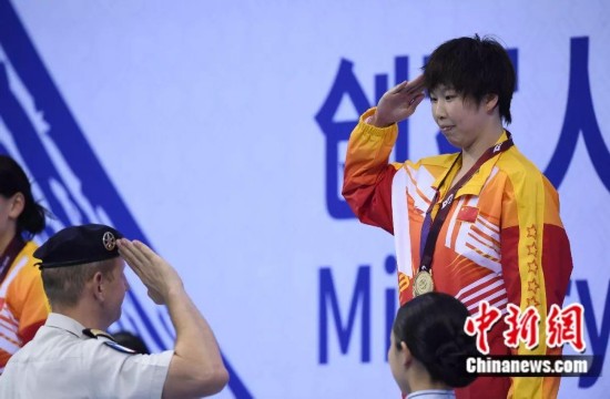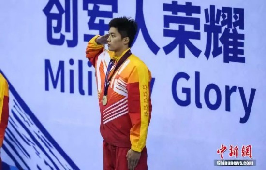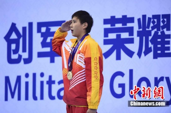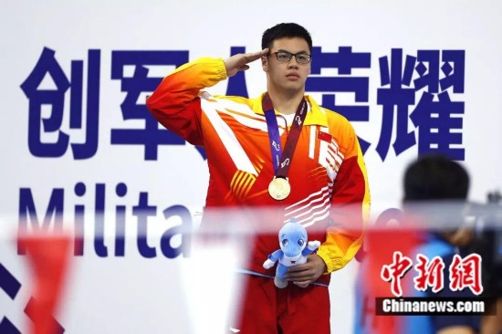 10月20日,第七届世界军人运动会游泳比赛男子200米个人混合泳决赛在湖北省武汉市举行,中国选手汪顺以1分56秒25的成绩打破国际军事体育理事会纪录夺得冠军。图为汪顺在颁奖仪式上。中新社记者 何蓬磊 摄