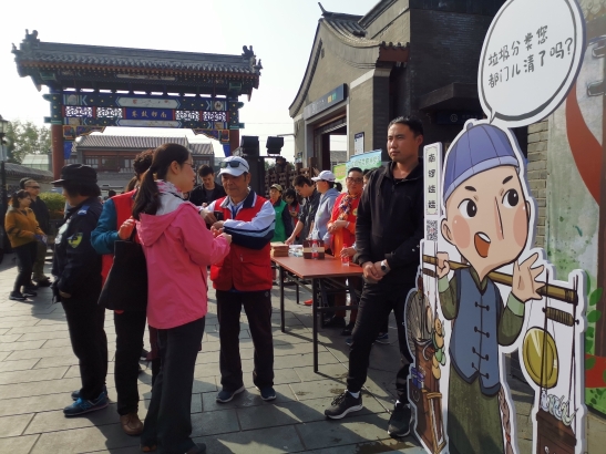 交道口街道南锣鼓巷管委会专职副主任轩拥军介绍,南锣鼓巷有166家商户,其中餐饮企业50家左右,是垃圾分类重点,南锣地区对商户的垃圾分类要求很严,所有餐饮商户都在店内标识了自己产品的垃圾分类提示,并倡导减少一次性用品提供。这个活动的目的是希望通过志愿者服务活动,让前来的游客主动进行垃圾分类。