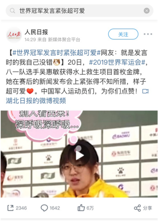 这两天,第七届世界军人运动会正在湖北武汉举行。今天(22日)下午,一条“#世界冠军发言时紧张超可爱#”的话题登上微博热搜,其中的主角正是20日在水上救生项目中夺金的八一队选手吴惠敏。
