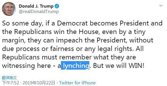 特朗普22一早发推说:“所有的共和党人必须记住他们在此所目睹的:一场私刑(lynching)。但我们将获胜!”