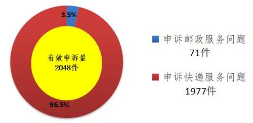通告称,处理的申诉中有效申诉(确定企业责任的)为2048件,同比下降55.7%。有效申诉中涉及邮政服务问题的71件,占有效申诉量的3.5%;涉及快递服务问题的1977件,占有效申诉量的96.5%。