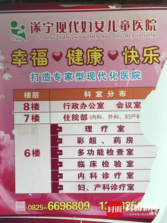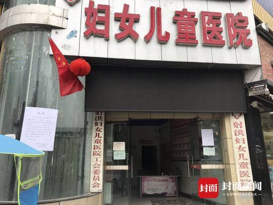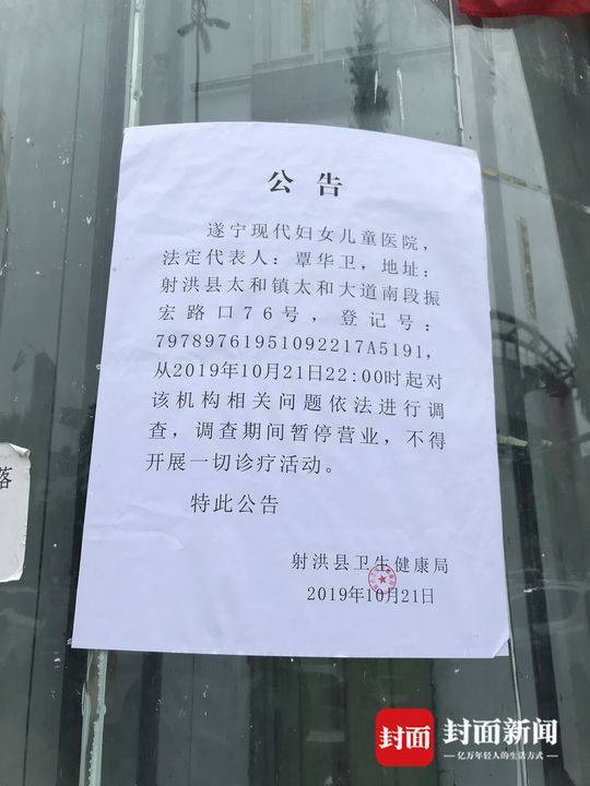22日中午,封面新闻记者在涉案医院发现,门口张贴着一张公告:遂宁现代妇女儿童医院,法定代表人:覃华卫,地址:射洪县太和镇太和大道南段振宏路口76号,登记号:79789761951092217A5191,从2019年10月21日22: 00时起对该机构相关问题依法进行调查,调查期间暂停营业,不得开展一切诊疗活动。