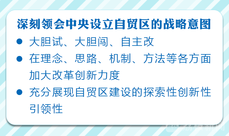 会议指出,要深刻领会中央设立自贸区的战略意图,以解放思想为引领、制度创新为核心、市场需求为导向、解决实际问题为着力点,在国家顶层设计框架内,在守住稳定、安全、生态、廉政四条底线的前提下,大胆试、大胆闯、自主改,在理念、思路、机制、方法等各方面加大改革创新力度,充分展现自贸区建设的探索性创新性引领性。