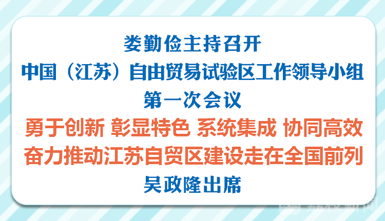 荔枝新闻讯 10月22日,中国(江苏)自由贸易试验区工作领导小组召开第一次会议,贯彻落实习近平总书记关于自贸区建设系列重要论述,讨论审议有关文件,研究部署全省自贸区建设工作。省委书记、中国(江苏)自由贸易试验区工作领导小组第一组长娄勤俭主持并讲话,他强调,要以习近平新时代中国特色社会主义思想为指导,准确把握江苏自贸区建设的责任使命,坚持高标定位、高点起步、系统集成,全力打造国内一流、国际公认的自贸试验区,奋力走在全国自贸区建设的前列。省长、中国(江苏)自由贸易试验区工作领导小组组长吴政隆出席会议。