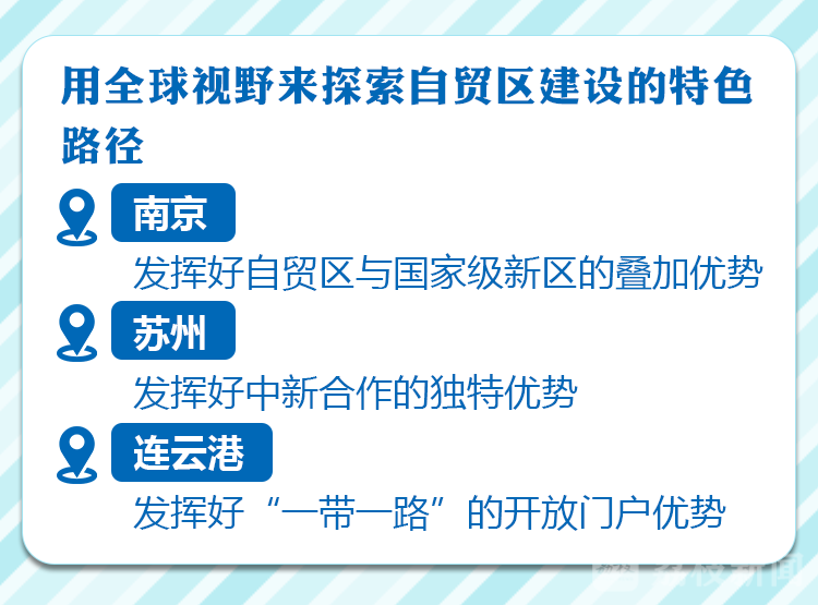 会议强调,要用全球视野来探索自贸区建设的特色路径。围绕中央提出的打造“开放型经济发展先行区、实体经济创新发展和产业转型升级示范区”的战略定位,南京要发挥好自贸区与国家级新区的叠加优势,苏州要发挥好中新合作的独特优势,连云港要发挥好“一带一路”的开放门户优势,形成各扬所长、错位发展、优势互补的发展格局。要统筹考虑自贸区与综保区、海关特殊监管区等周边平台载体的规划衔接和功能整合,促进功能外溢,实现联动发展、一体推进。