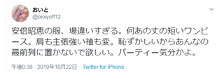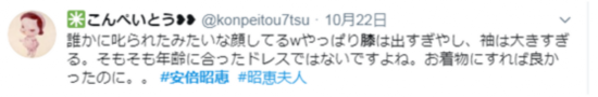 “安倍昭惠的衣服太不合时宜了。那件短连衣裙是怎么回事。左右袖子还那么宽。太丢人了,别坐在最前排了。给人参加派对的感觉。”