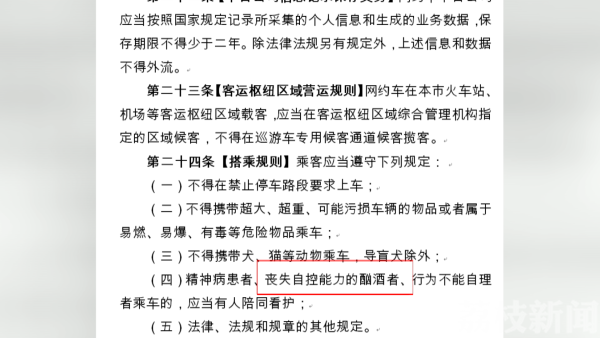 近日,南京市交通运输局在官网上发布的《南京市网络预约出租汽车管理办法》公开征集意见公告,已经要求"丧失自控能力的酗酒者、行为不能自理者",应当有人陪同看护。